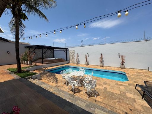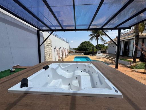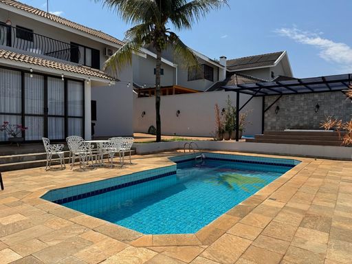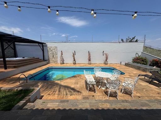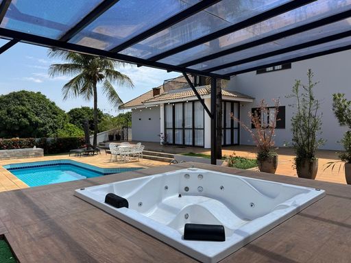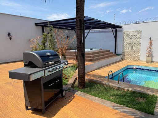 • Área externa com piscina, jacuzzi e churrasqueira americana, cercadas por um belo jardim.